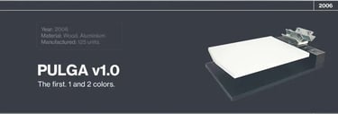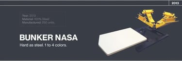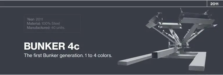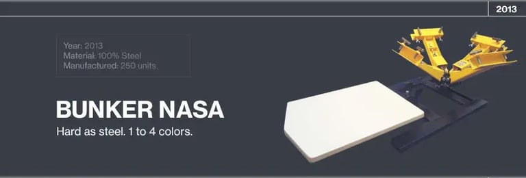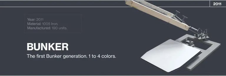 Ante la dificultad y el alto coste de importar maquinaria, decidí empezar a fabricar mis propias máquinas con los medios disponibles. Así nacieron las primeras máquinas KLP, fabricadas íntegramente en acero, de forma manual, en el taller y la herrería. Modelos como la Bunker (de 1 a 4 colores) y la Sputnik portátil tuvieron una gran acogida, vendiéndose cientos de unidades en los primeros años.