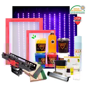 Kits con todos los componentes necesarios para hacer serigrafía, tintas ecológicas y nacionales y productos fabricados por KLP o procedentes de fabricas KM.0 y Europeas.