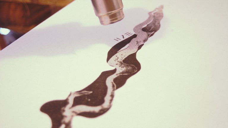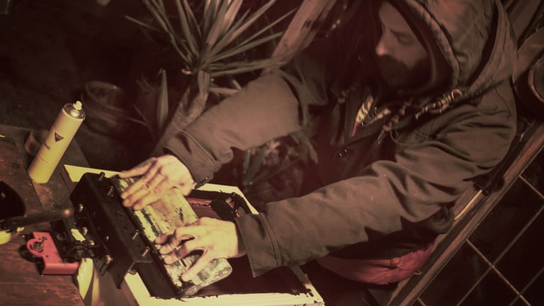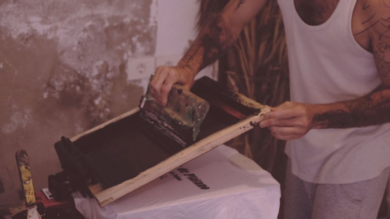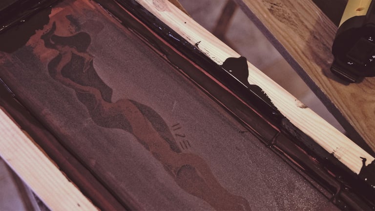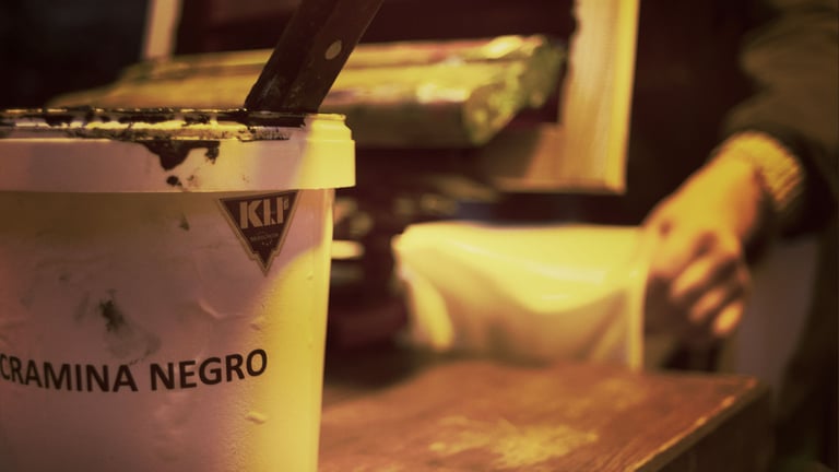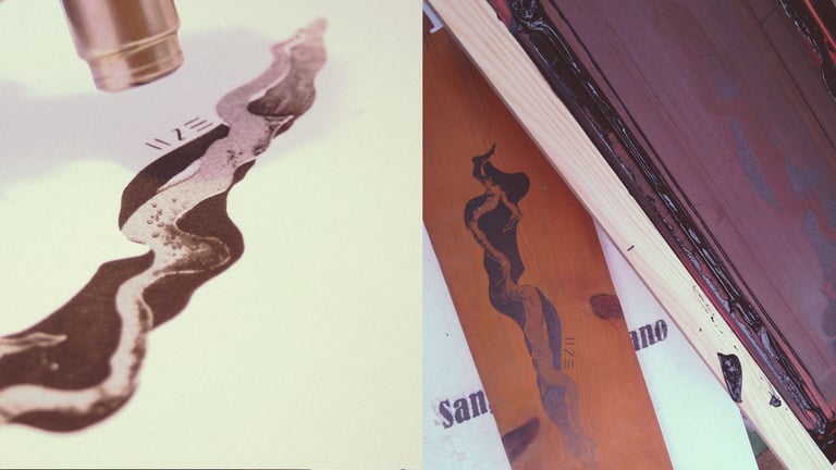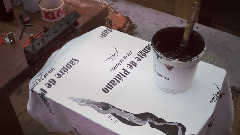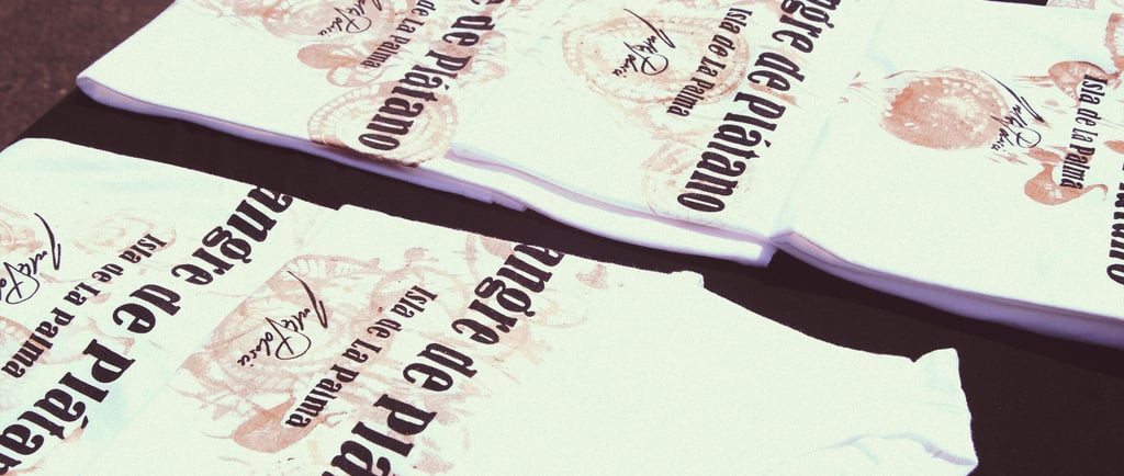 Para preparar la tinta hice una mezcla de ceniza fina recién traída de La Palma, tinta Acramina KLP y aroma de plátano natural creado por nuestros compañeros Fuego y Alquimia. Tras varias pruebas logré una tinta capaz de traspasar mallas de 62h, la serigrafía brillaba como cristales a la luz del sol.