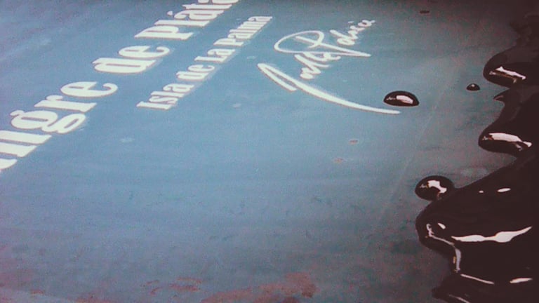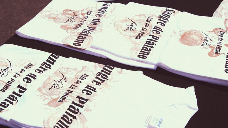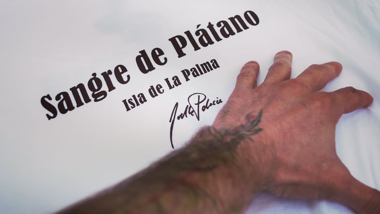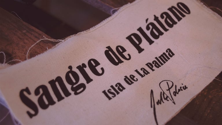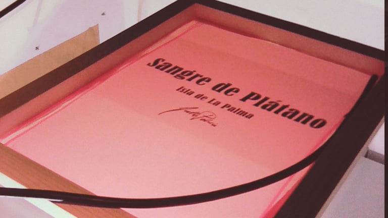 Queda terminada la primera parte del trabajo, serigrafías con el título Sangre de Plátano delante y la serigrafía de la Lava en la espalda, curiosamente una escultura que hice pocos meses antes de la erupción del Volcán de Cumbre Vieja.