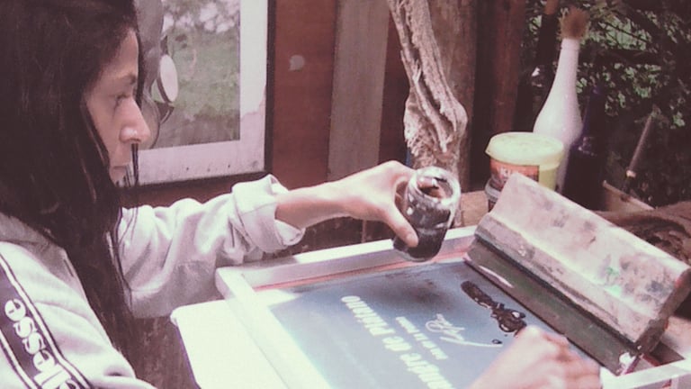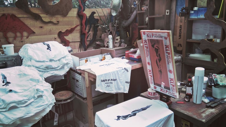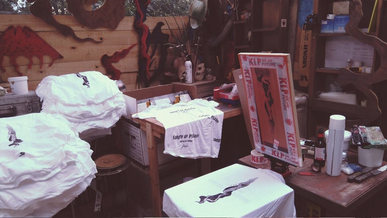 Realizamos con Joel Palasie las serigrafías que completan sus diseños realizados con sangre de plátano.