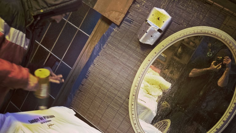 La hicimos en dos sesiones, la primera en Barcelona, aprovechando el trabajo para a la vez impartir el curso de serigrafía a mis compañeros Idory Shayn que recibieron la lección bajo una intensa lluvia. ¡Menuda experiencia!