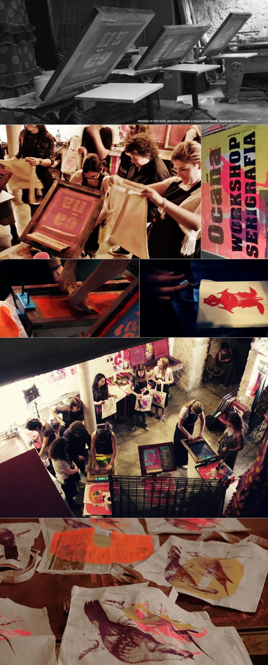 Demostración y práctica de serigrafía artística impartido por la fantástica Kris Prats de Serigrafiart, en el subsuelo del club Ocaña en la plaza real de Barcelona. Se utilizaron tres máquinas KLP Sputnik a un color experimentando con varios dibujos y colores en la impresión.