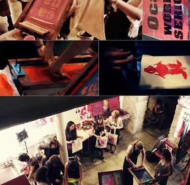 Demostración y práctica de serigrafía impartido por la fantástica Kris Prats en el subsuelo del club Ocaña en la plaza real de Barcelona.